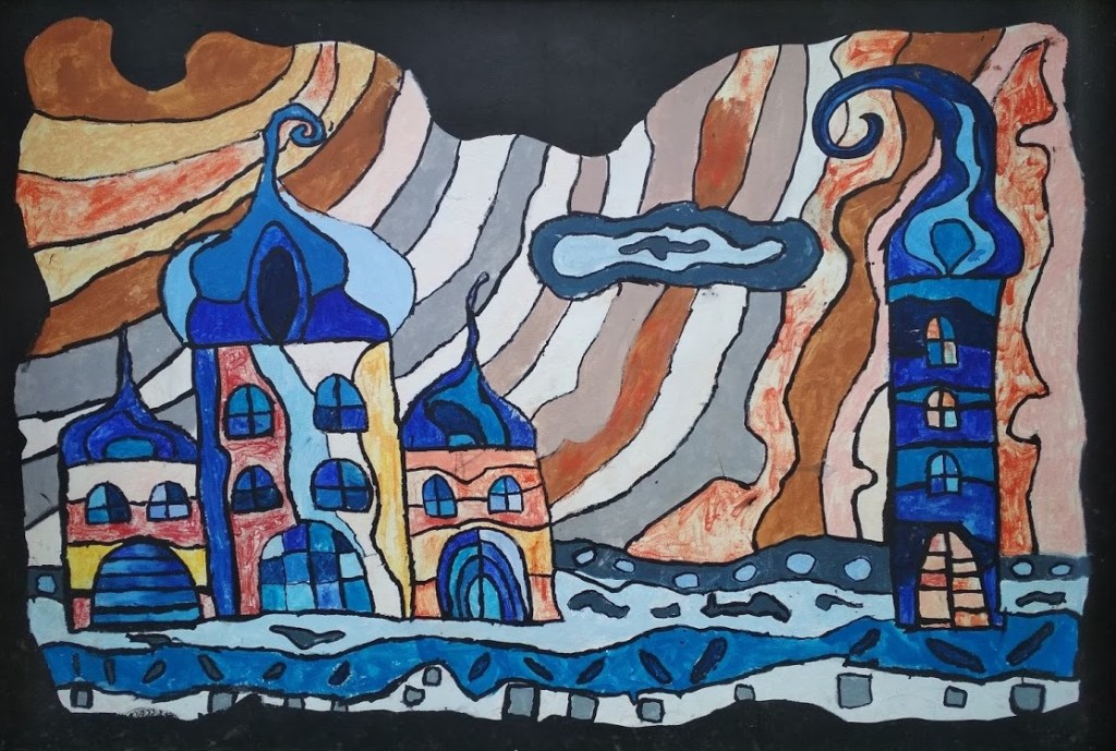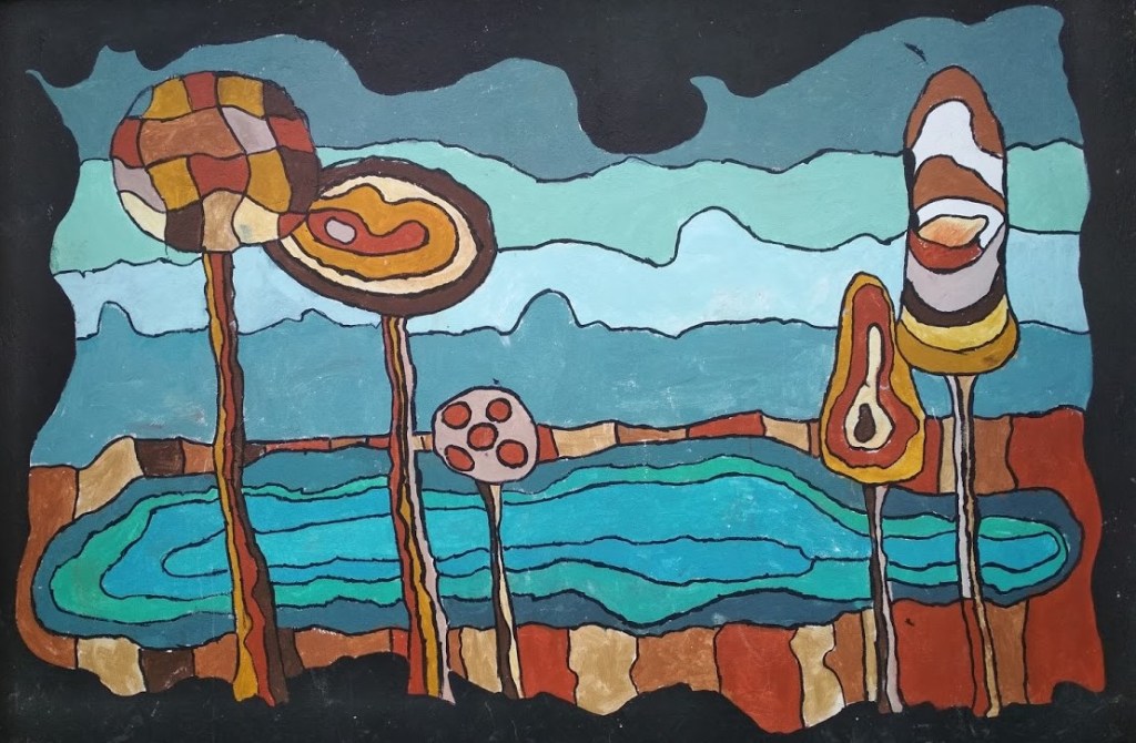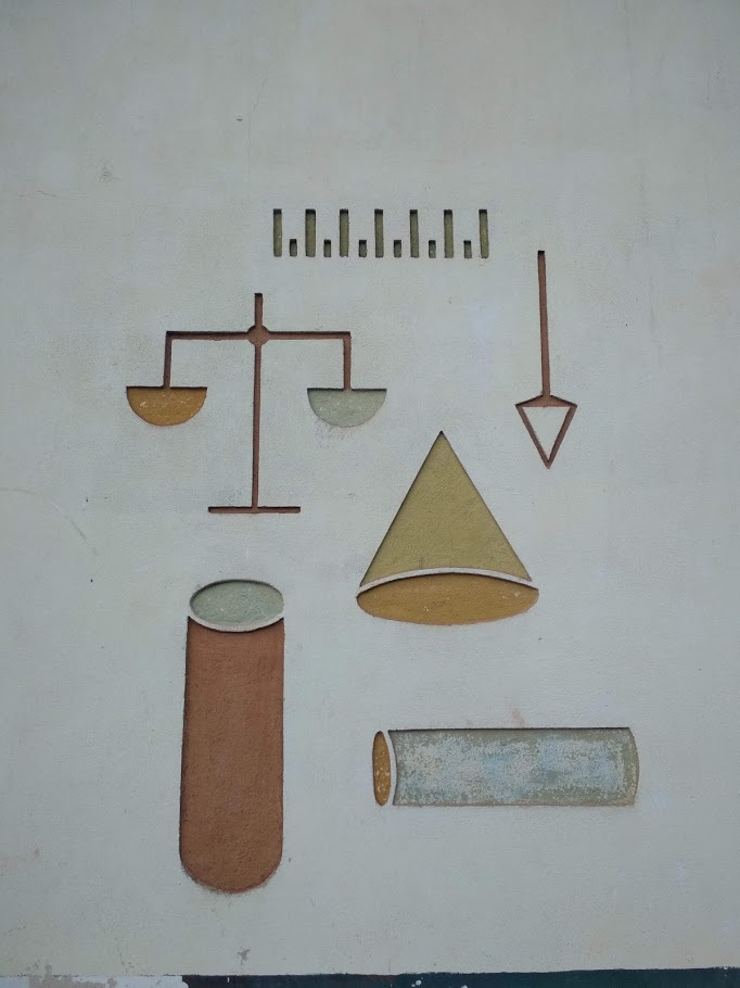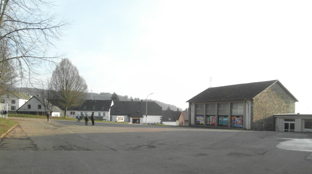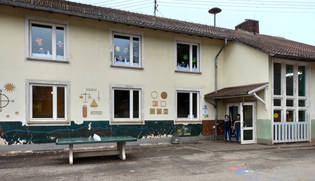 Bis zur Neugestaltung 2023 war die Wand zum Schulhof mit geometrischen Figuren und der Darstellung des Verlaufs des Wadrillbachs von der Quelle bis zur Mündung aufgelockert. Hier der Ausschnitt, der Wadrill zeigt.