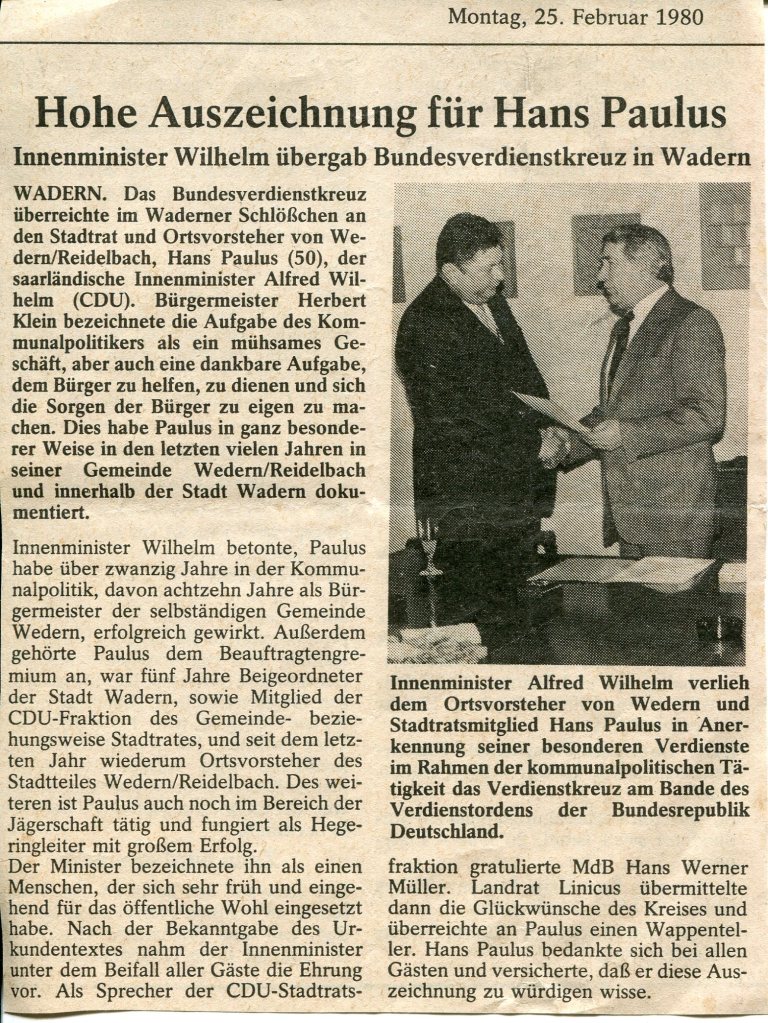 18 Jahre Bürgermeister von Wedern/Reidelbach, danach Ortsvorsteher