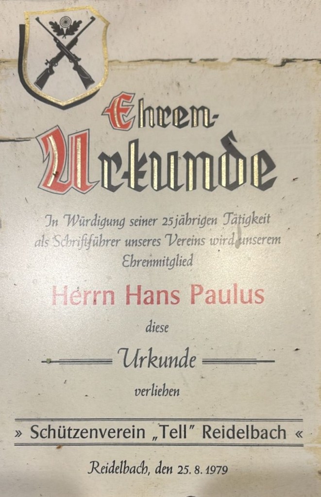 1955 bis 1989 Mitgliedschaft im Schützenverein Wilhelm Tell Reidelbach