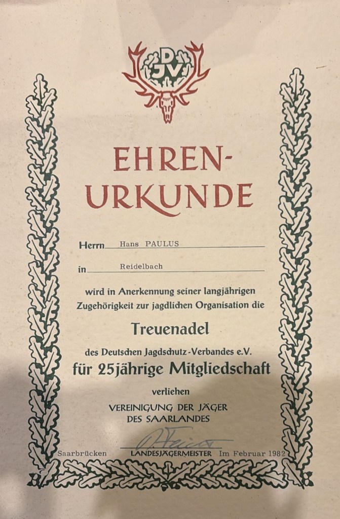 1957 – 1989 Mitgliedschaft in der Vereinigung deutscher Jäger