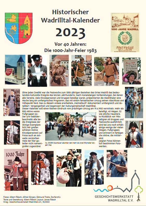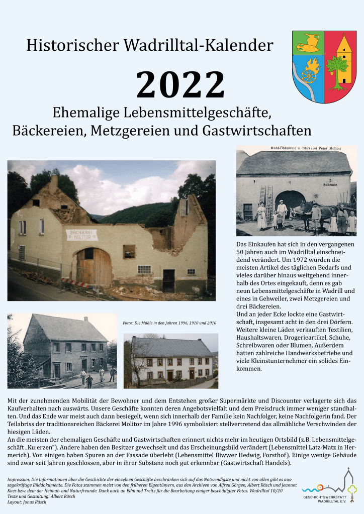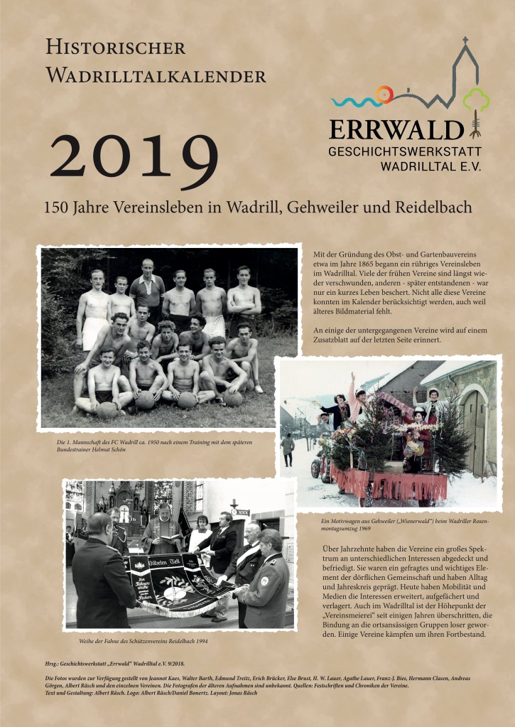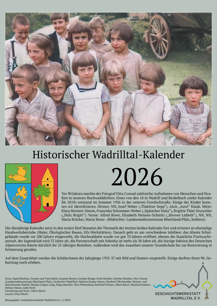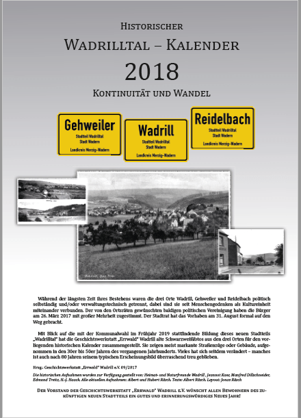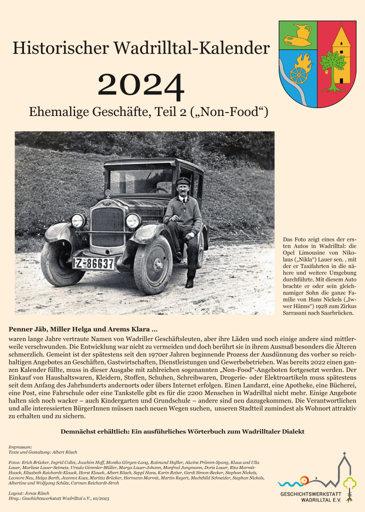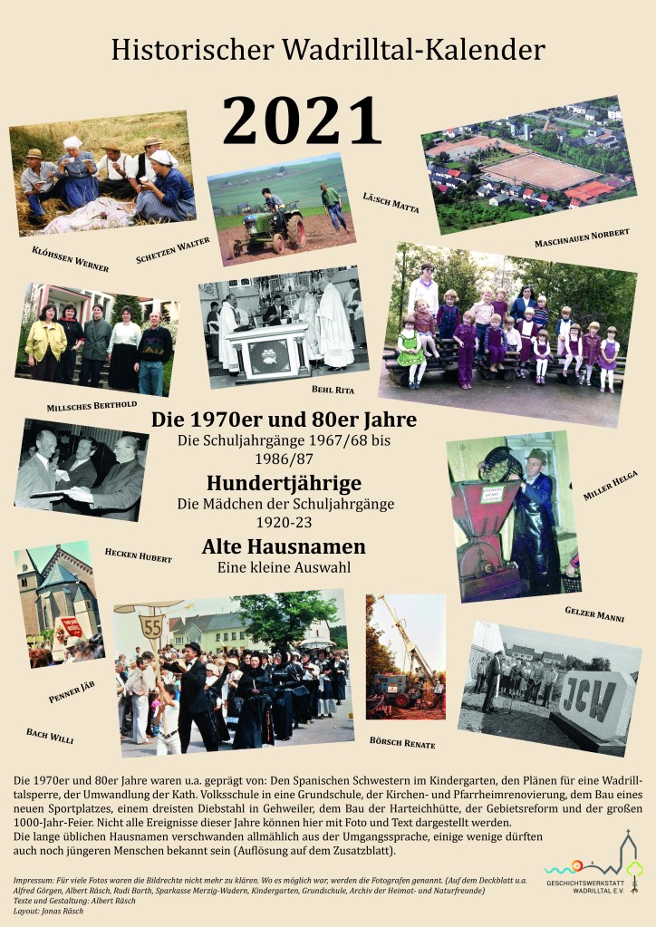 Der Kalender für 2025 widmet sich schwerpunktmäßig den Wadrilltaler Handwerksbetrieben, die in irgendeiner Form mit dem Hausbau beschäftigt waren, also den Zimmerleuten, Dachdeckern, Schmieden, Schreinern uva. Zunächst wird an die ehemaligen Friseurgeschäfte Schmitt, Gastauer und Regert erinnert. Das Zusatzblatt stellt die zweitälteste Gastwirtschaft in Wadrill („Fritzen“) vor.