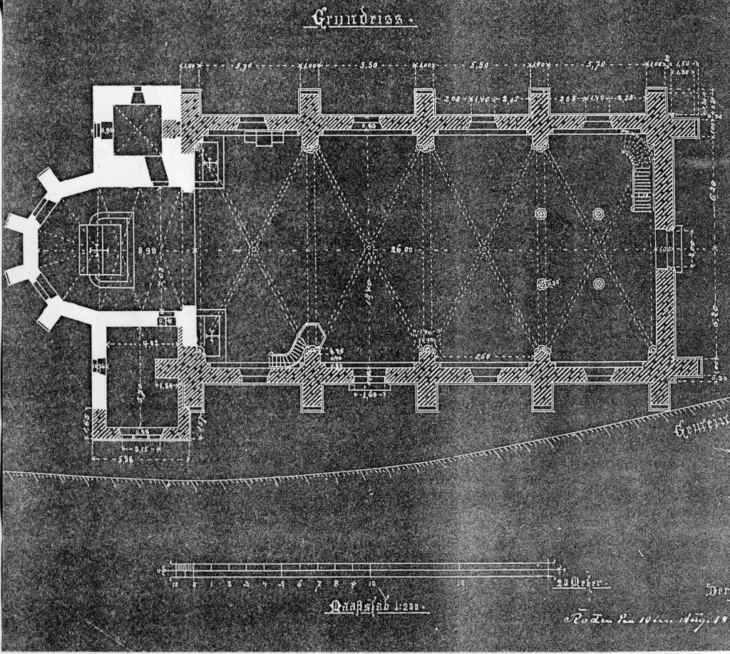 „Ich erlaube mir Ew. (Euer) Wohlgeboren einen Vorschlag zu machen, den man einem Techniker zur Prüfung vorlegen könnte. Schiff, Chor und Sakristei der jetzigen Kirche stehen gerade 100 Jahre. Bei einem Erweiterungsbau könnten außer dem Turm auch der Chor mit seinem schönen Kreuzgewölbe und die Sakristei stehen bleiben.